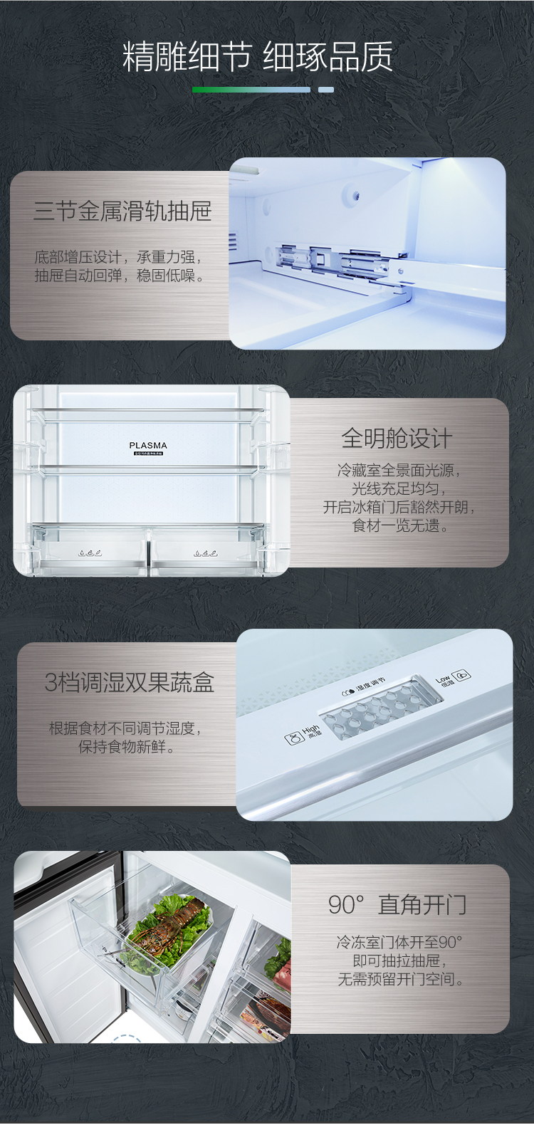 搭載-5℃嫩凍凝鮮科技,鮮嫩兩星期,輕松一刀切。Plasma等離子除菌凈味,除菌保鮮,長久新鮮。4檔保鮮模式,多重角色時刻新鮮。